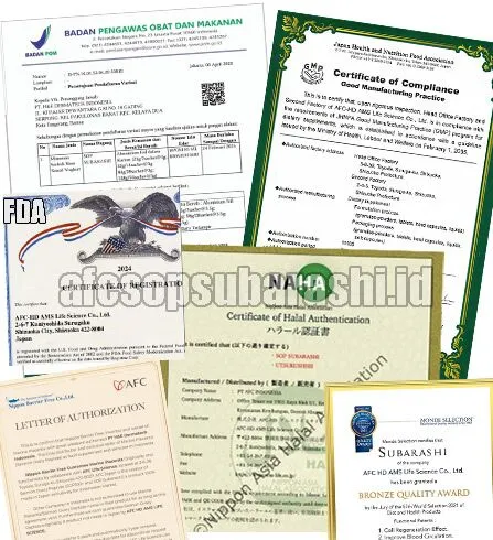 Sertifikasi ini menunjukkan bahwa produk AFC memenuhi standar keamanan dan kualitas internasional yang ketat, memastikan bahwa produk ini aman dan efektif untuk dikonsumsi.